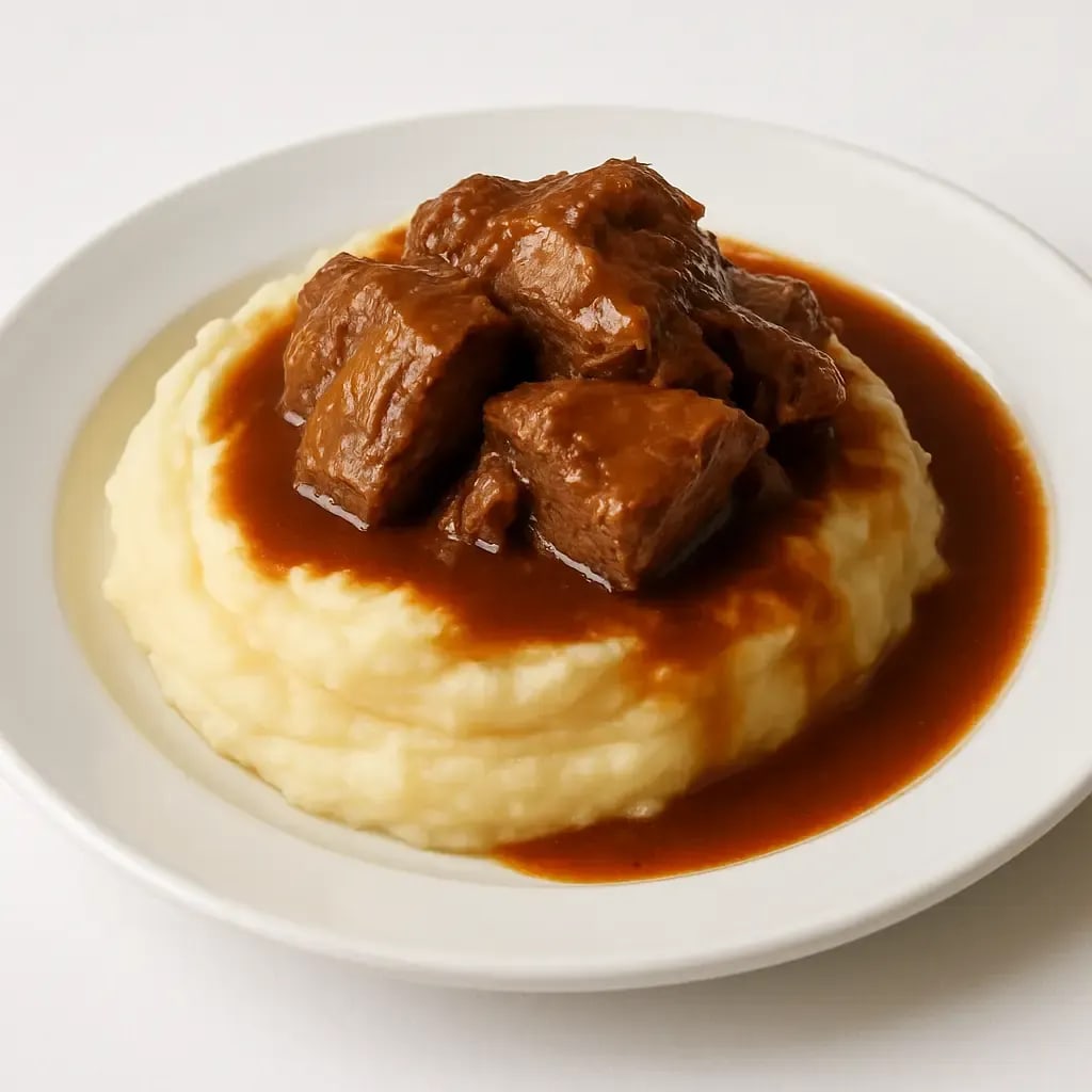 Consejos: para un sabor más profundo, puede sellar la carne y terminar en horno a 160 °C a fuego muy bajo por 1–1.5 horas en lugar de cocer solo en la estufa. Ajustar la consistencia del puré con leche caliente y la del jugo con más reducción o maicena al gusto.